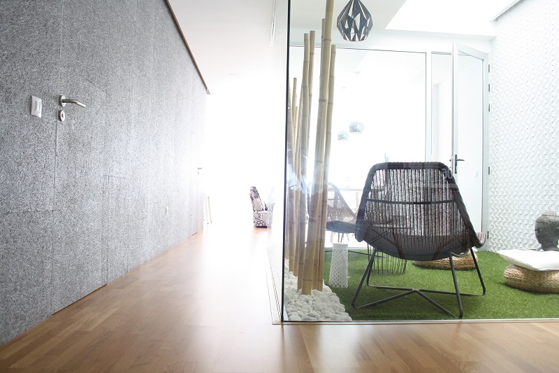 Otro punto interesante de su vivienda, es la idea de separar la zona de noche y más privada, de la zona de día ocultando las puertas en una pared revestida de paneles de virutas de madera pintada en un tono gris que le da un toque decorativo resaltando esta textura tan especial.