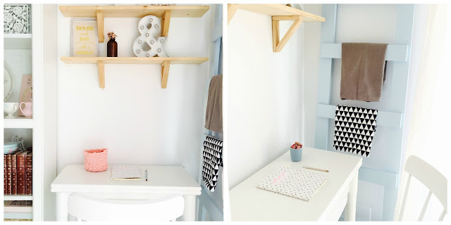 La escalera pintada de azul y colocada en este rincón entre el ventanal que da salida al balcón y la zona de estudio, es otro de los trabajos hechos por ella. ¿Preciosa verdad?