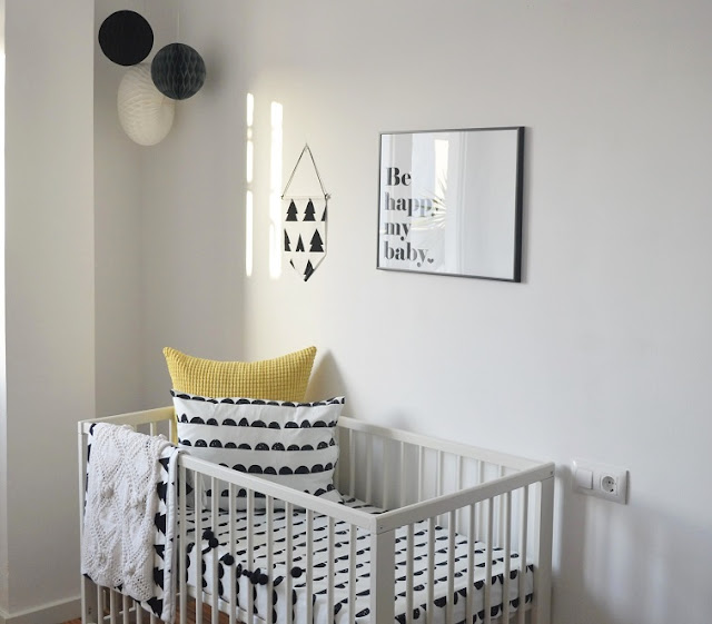 Es una habitación sencilla, con una base en blanco y negro con pequeños detalles en color. Las láminas y el vinilo con el nombre del peque le dan ese toque personal.