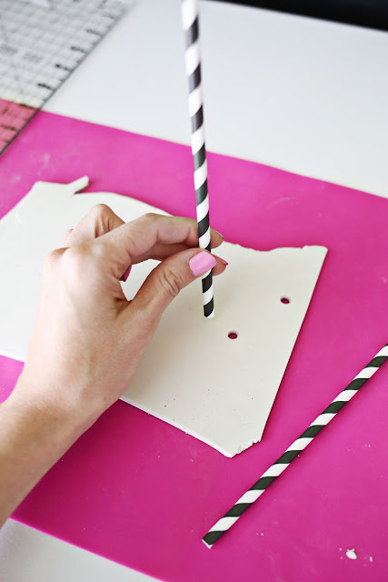 Ahora, poco a poco, vamos haciendo agujeros con la pajita. Podemos hacer tantos como queramos (siguiendo un patrón, a lo loco….) pero es importante no hacer demasiados para que la pieza no rompa.