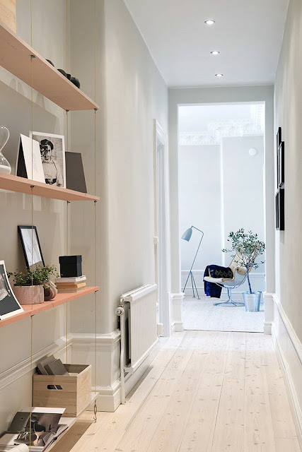 Como a ti, a mí esa estantería colgante del pasillo me ha enamorado. Le da un toque delicado a la vez que no da sensación de agobio en esa zona más estrecha de la casa. Asimismo tampoco dejo pasar el detalle del despacho, me encanta el estante del frontal 🙂