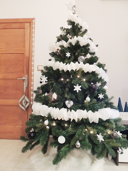 El año pasado (una que es la mar de previsora), me había comprado algunos adornos en negro y plata en una tienda que estaban liquidando. Pesan bastante y no podía colocarlos en el árbol de palitos, pero sabía que tarde o temprano tendría un árbol resistente «de los de verdad» y llegaría el momento de poder lucirlos. Así que en cuanto compramos EL árbol, me hizo muchísima ilusión estrenar las bolitas negras y todos los colgantes imitación plata vieja que había comprado.