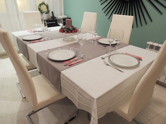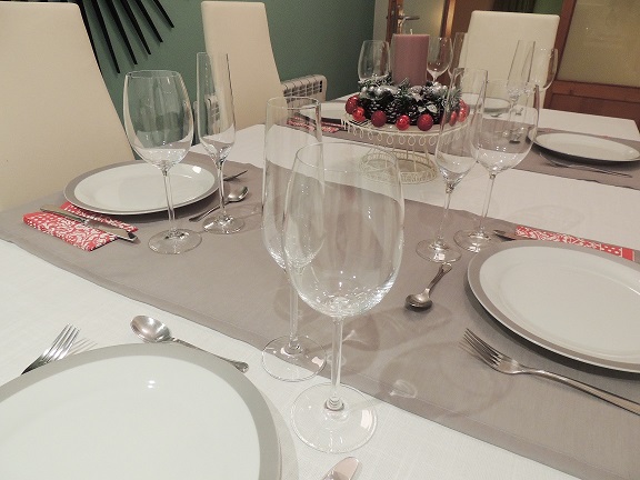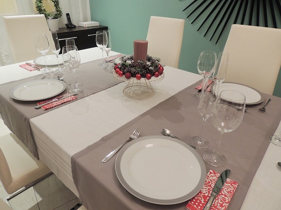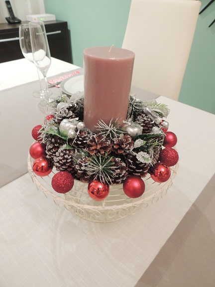 Además, este año nos tocó celebrar la cena de fin de año y la comida de año nuevo en nuestra casa. Después de buscar un montón de ideas en Pinterest para hacer un centro de mesa bonito, elegí esta corona sencilla y la adorné con unas bolitas en rojo a juego con las servilletas y los salva manteles del día 1. No me parecía práctico tener un centro demasiado grande porque se que después, tendríamos problemas para colocar la comida y acabaríamos quitándolo. Así estuvimos la mar de cómodos y con el detalle de la vela, la cena se hizo más acogedora.