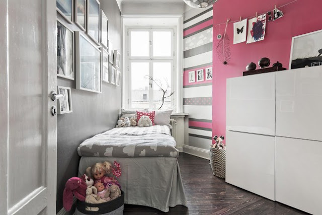 Gracias a que, como en la cocina, la pared de la habitación se abre, han podido colocar una cama al fondo, bajo la ventana y aprovechar la pared larga para colocar muebles de almacenaje y un pequeño escritorio. El contraste de rosa, con el toque sobrio del gris me encanta. Hace que la habitación siga siendo de princesas, pero sin ese punto recargado.