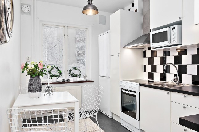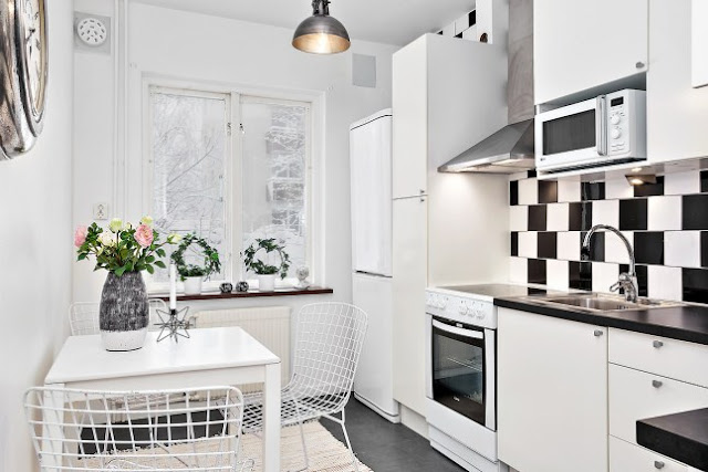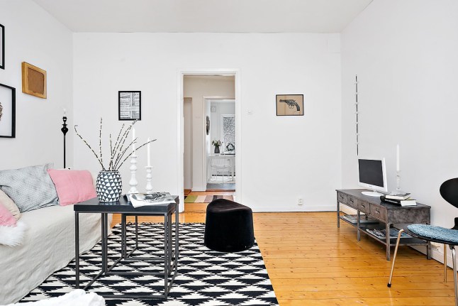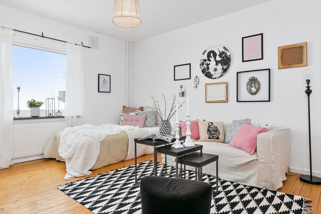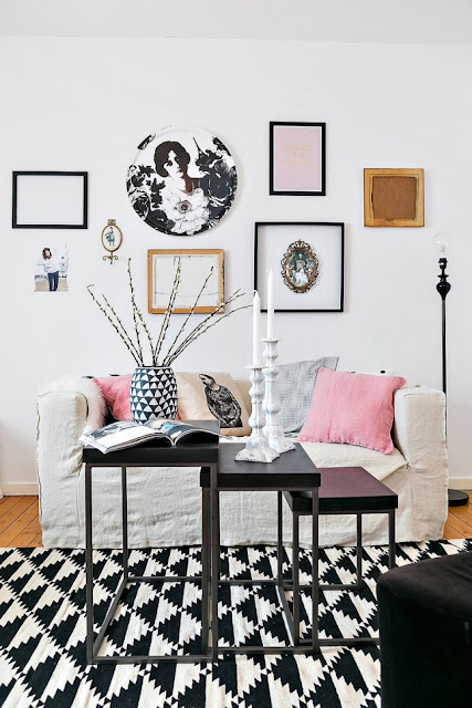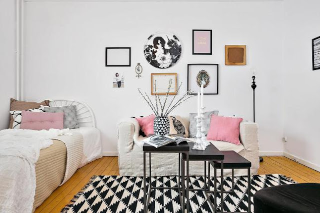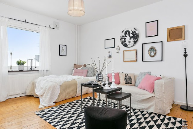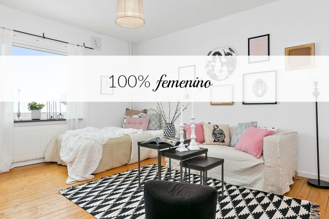 Me encanta la combinación del blanco y negro con toques más suaves como el rosa o el gris clarito de los cojines.