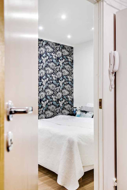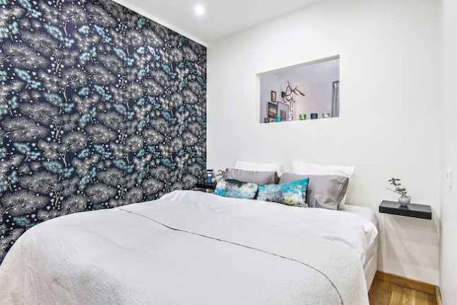 Además, el papel de pared de uno de los laterales continúa con el contraste entre colores claros y oscuros y aporta profundidad a la habitación. Es verdad que yo no hubiera elegido ese motivo porque me parece que carga un poco el espacio, pero aun así, coincido en que han conseguido su propósito.