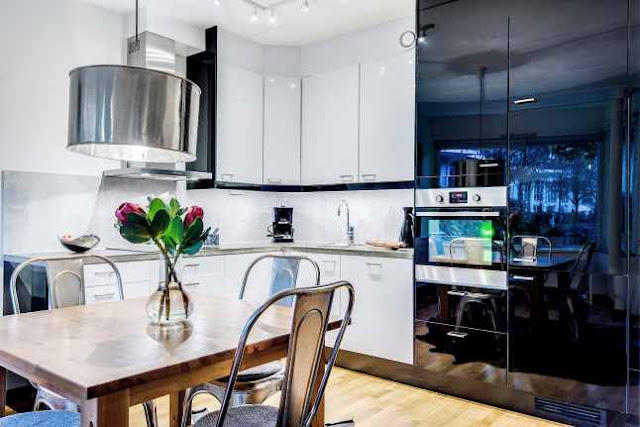 La zona de salón comparte espacio con el comedor, así que para no cargar el espacio, se han decidido sólo por los muebles básicos. El apartamento (como no), está todo pintado en blanco, sin embargo el toque de negro está muy presente en elementos como el sillón y la butaca y gran parte de la cocina. Así se consigue contraste y un punto de atención diferente al tamaño.