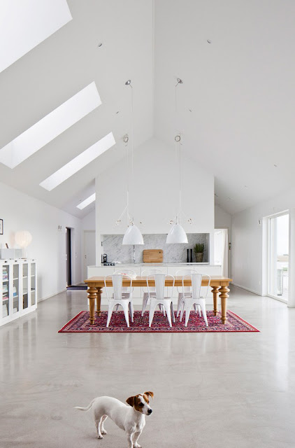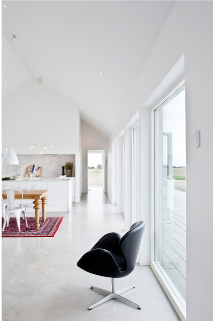 Me encantan las casas de campo, y sería genial vivir en plena naturaleza, aunque tiene sus inconvenientes, claro. Me gusta mucho la decoración en blanco y las notas de color en complementos como cojines, alfombras, cuadros…Pero esta casa, aunque me gusta el estilo y sus alrededores, me parece demasiado grande, al salón-cocina-comedor le falta calidez para mi gusto. Eso sí, la terraza, ¡me la pido! ¡Feliz lunes!